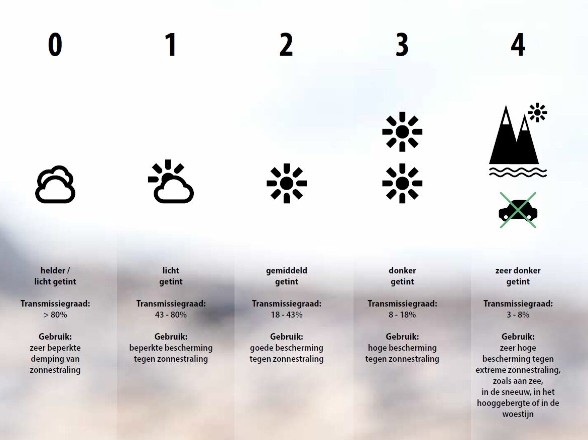 Zonnebrillen worden onderverdeeld in zogenaamde filtercategorieën, die je een indicatie geven van de weersomstandigheden waarin de bril het beste zicht biedt. De waarde 1 tot 4 geeft aan hoe sterk getint de glazen zijn en hoeveel zichtbaar licht door de glazen heen dringt.